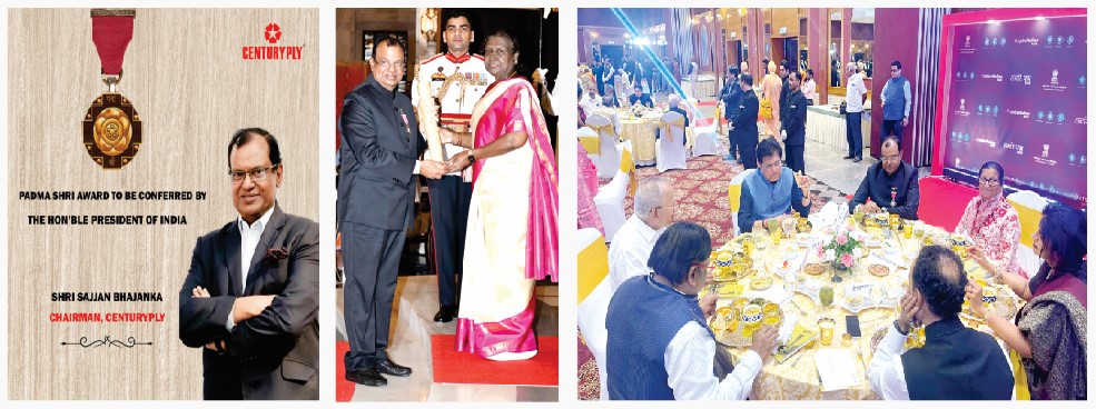 सेंचुरी प्लाईबोर्ड के चेयरमैन श्री सज्जन भजनका को राष्ट्रपति द्रौपदी मुर्मू ने पदम श्री पुरस्कार से सम्मानित किया। उन्हें व्यापार और उद्योग में उनके असाधारण योगदान के लिए सम्मानित किया गया।
